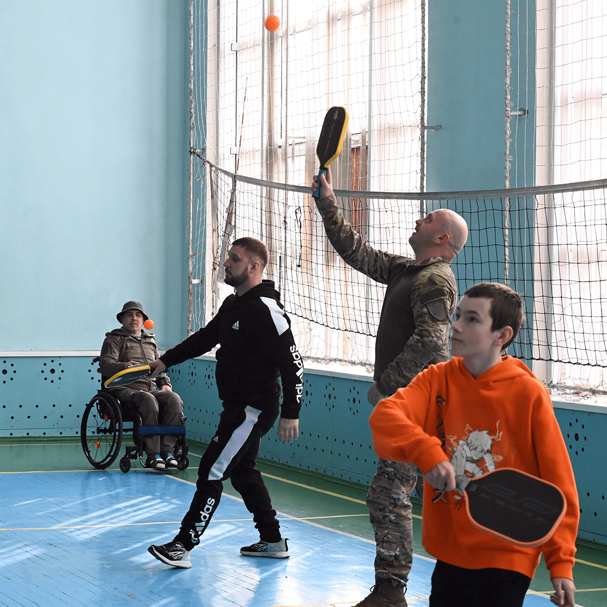 Ukrainian civilians of all ages enjoy a friendly game of pickleball in a local gym, reflecting how the sport brings people together through movement and connection.